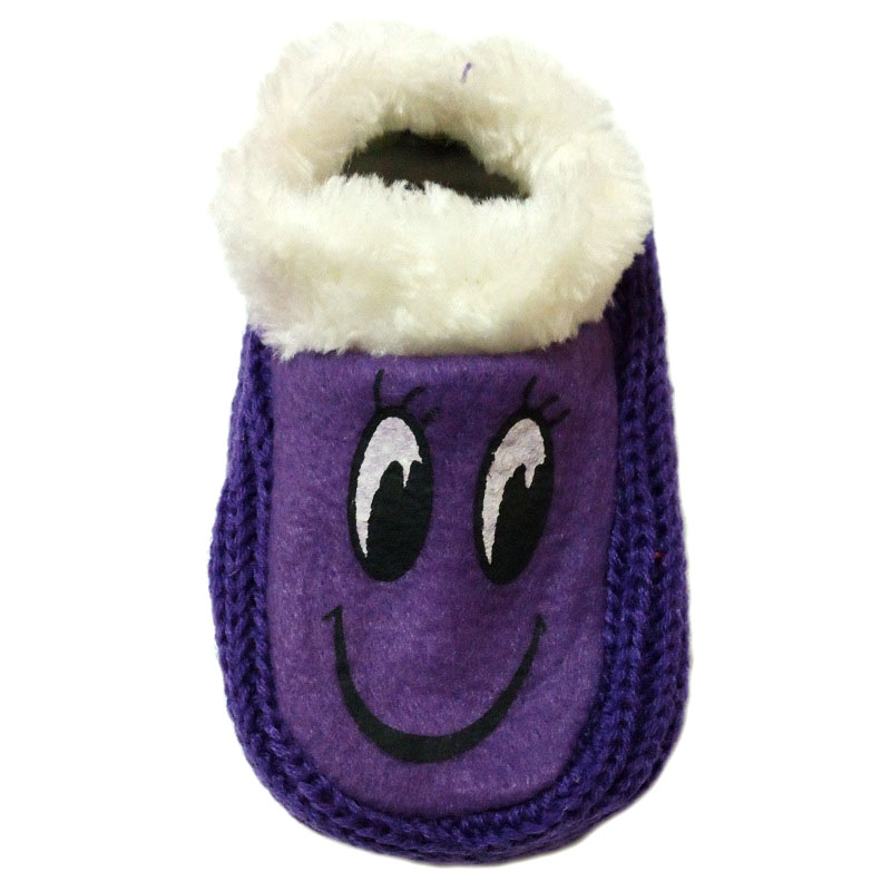 Тапочки детские вязаные, с опушкой, сверху украшены рисунком в виде "глазок". На подошве антискользящее покрытие. В упаковке по 4 пары на размер. Размер указан по длине подошвы в сантиметрах.