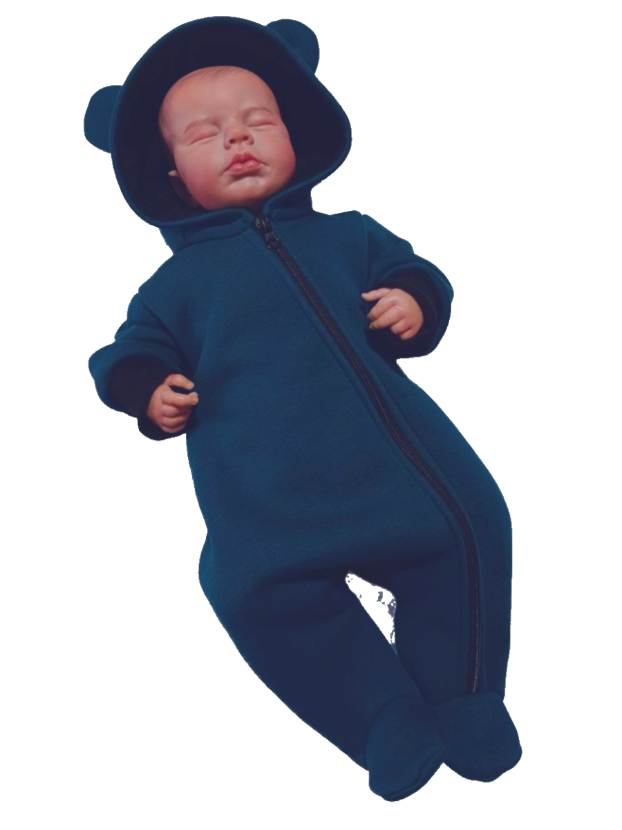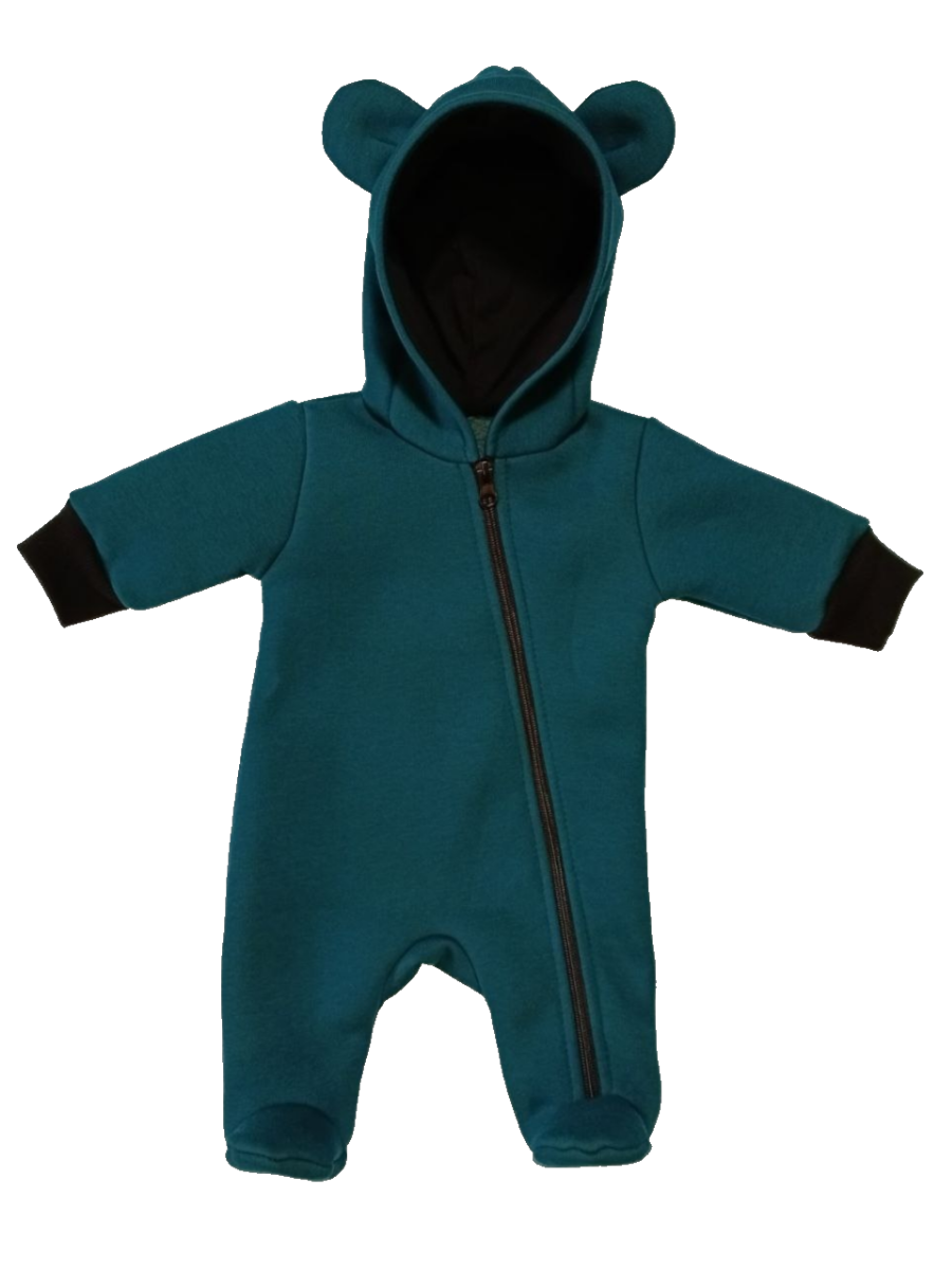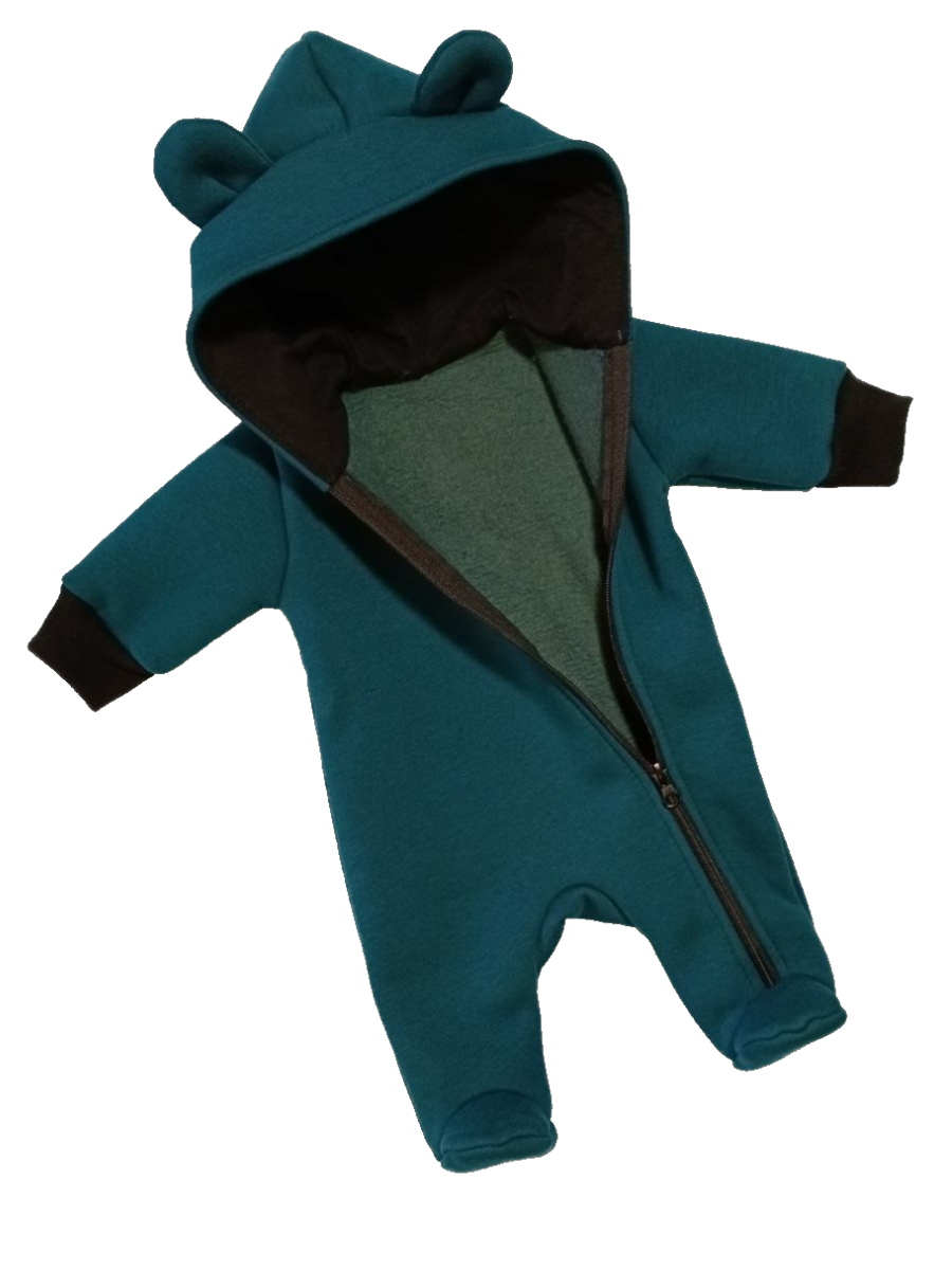 Комбинезон с закрытыми ножками, с капюшоном на подкладке, на молнии по всей длине и до конца одной ножки.