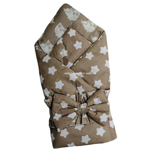 Одеяло выполнено из ткани с двумя разными рисунками, размер 100*100 см. Одеяло можно использовать для укутывания новорождённого, воспользовавшись для закрепления бантом на резинке, который идёт в комплекте.